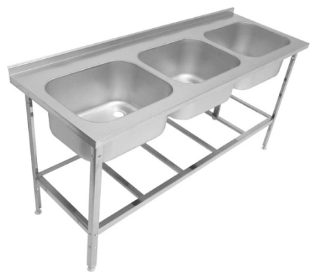 Ванна моечная сварная трёхсекционная с бортом и полкой под смеситель. Ёмкости ванны выполнена из нержавеющей стали марки AISI304. Углы ванн заварены и зашлифованы. Каркас ванны может быть выполнен из крашенной/оцинкованной/нержавеющей стали. Стойки каркаса — уголок. Все кромки ванны имеют подгиб, что полностью исключает получение травмы персоналом при сборке, эксплуатации и санитарной обработке ванны. Опорные ножки регулируются по высоте.