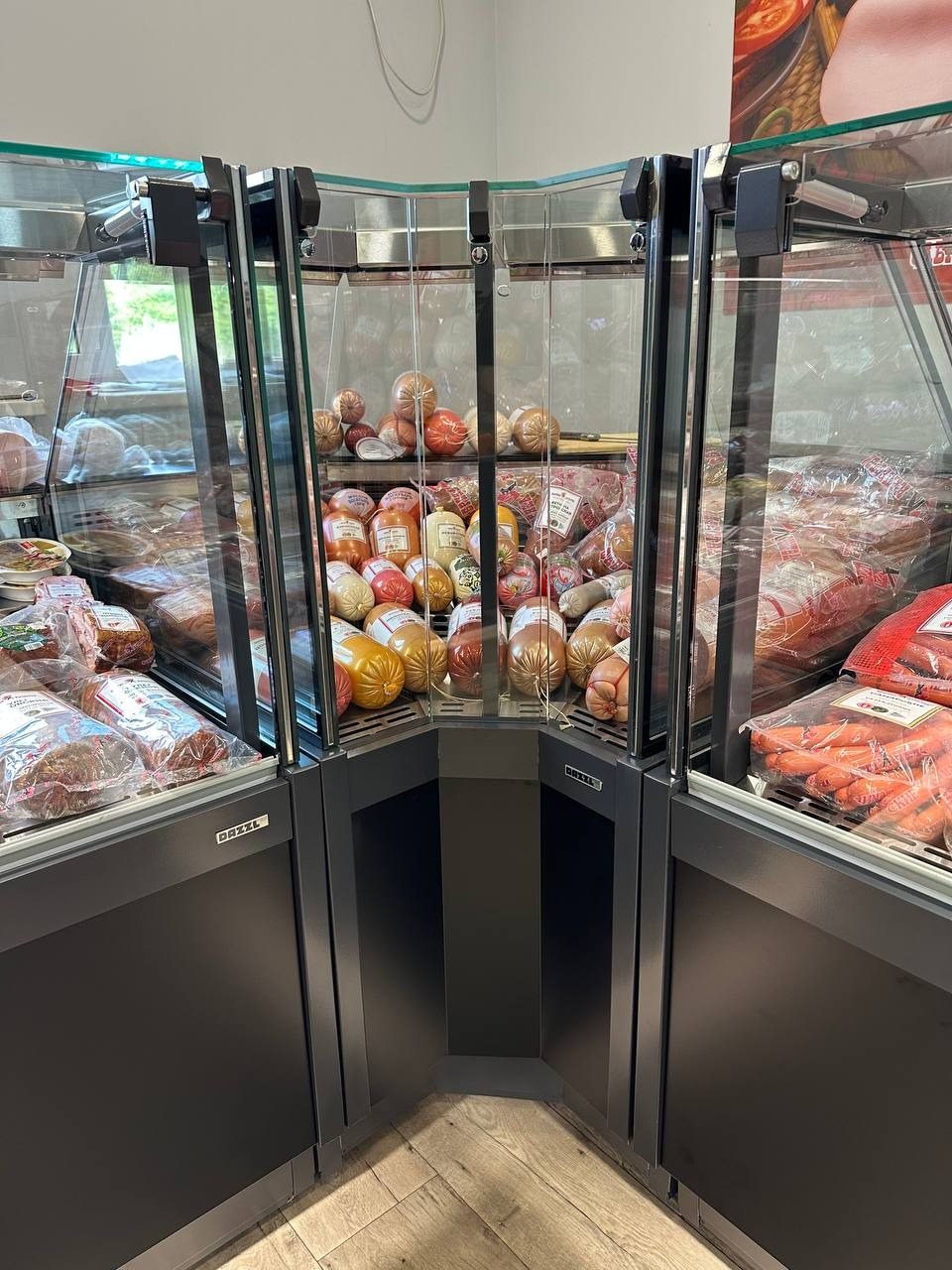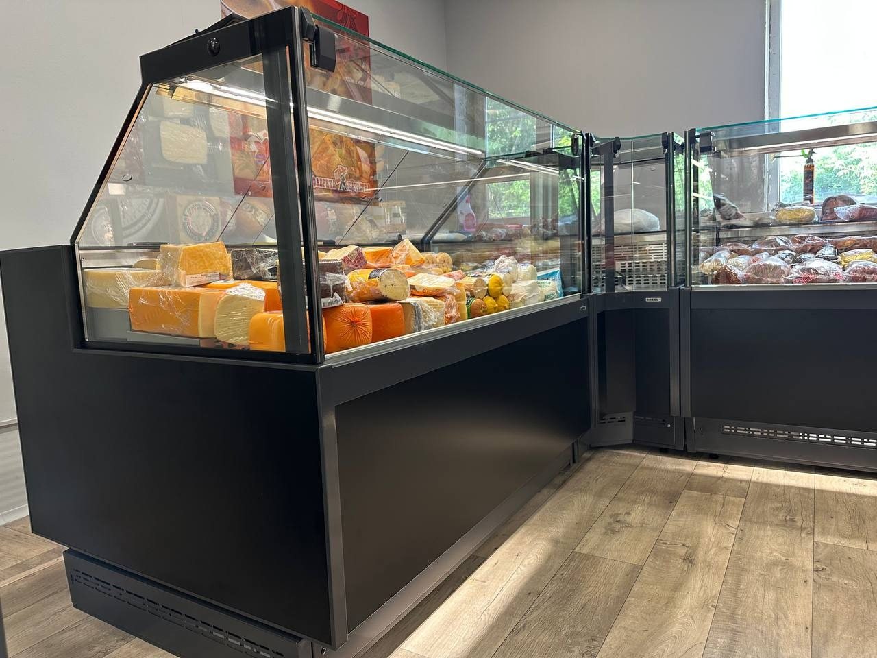 Магазин оснащен холодильным оборудованием торговой марки Dazzl™. Обратите внимание, что витрины имеют подсветку нижнего фронта, что создает эффект парения. А актуальный современный дизайн плоских и прямых форм предлагает отличную обзорность продукции.